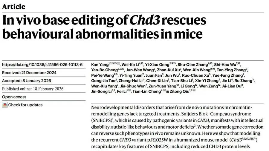 以自闭症为代表的神经发育性疾病,困扰着无数家庭,长期以来“无药可用”的困境让患者家庭背负沉重的身心与经济压力。北京时间2月19日凌晨,国际权威学术期刊《自然》在线发表一项重磅成果,为这类疾病的基因治疗带来突破性进展。该研究验证了脑内精准基因编辑的可行性,更让全球神经发育疾病患者家庭看到了治疗的曙光。