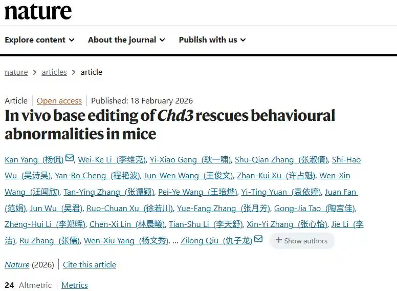 上海交通大学医学院附属新华医院李斐教授、杨侃副研究员团队与松江研究院仇子龙教授团队、复旦大学脑科学转化研究院程田林研究员团队和中国科学院分子细胞科学卓越创新中心李劲松院士团队通力合作,聚焦由 CHD3 基因突变导致的 Snijders Blok–Campeau 综合征(SNIBCPS)这一典型神经发育性疾病,实现了脑内基因位点的精准“修错”。