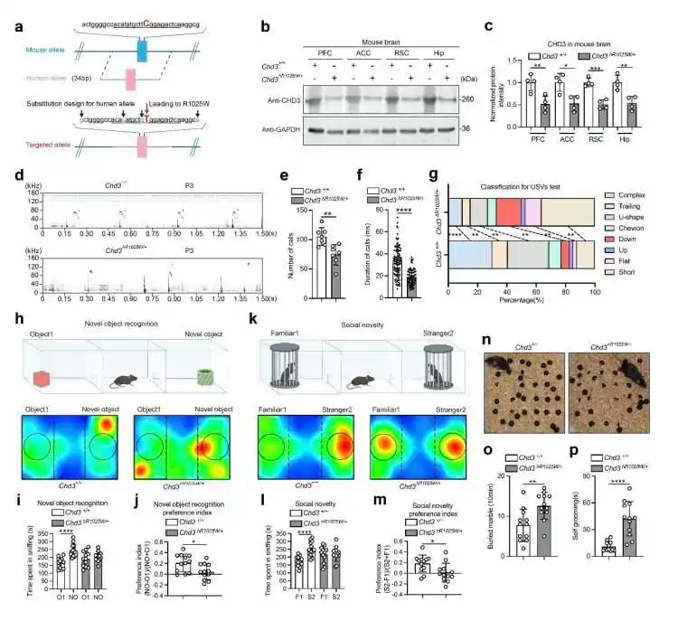 针对临床中已明确的CHD3-R1025W热点高频突变,研究团队首先构建了人源化的突变小鼠模型。这些小鼠完美复刻了患者的核心症状,出现了社交回避、重复刻板动作、认知迟钝、发声异常以及运动不协调等行为异常,为后续治疗研究搭建了精准的“疾病模拟平台”。幸运的是,尽管SNIBCPS症状繁杂,但病因和靶点清晰,为后续“精准开锁”的基因编辑治疗奠定了基础。