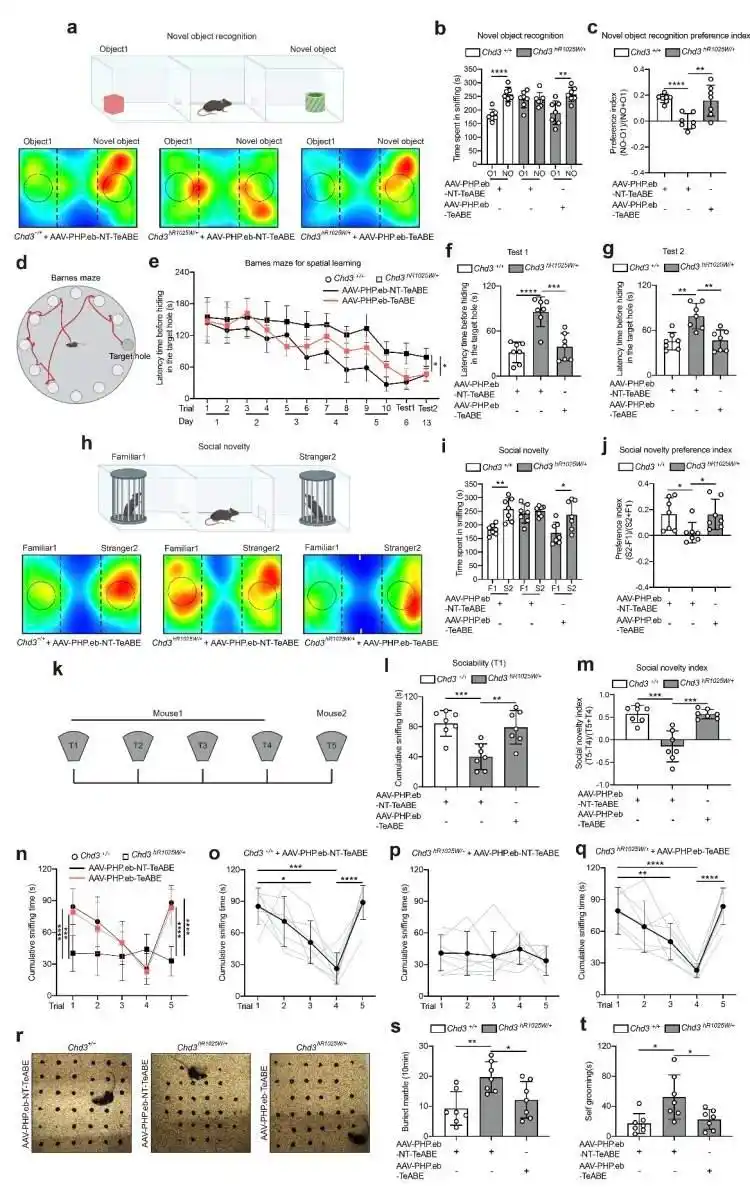 更关键的是,随着CHD3蛋白水平显著恢复,小鼠的行为异常也得到了直接的改善。在三箱社交实验中,原本回避同伴的小鼠开始主动与同类互动;在新物体识别实验中,它们能清晰分辨新物体与熟悉物体,认知缺陷得到缓解;在巴恩斯迷宫学习实验中,其学习和记忆能力也恢复正常。同时,小鼠的运动能力也同步提升,肌张力增强,原本不协调的步态变得稳健。